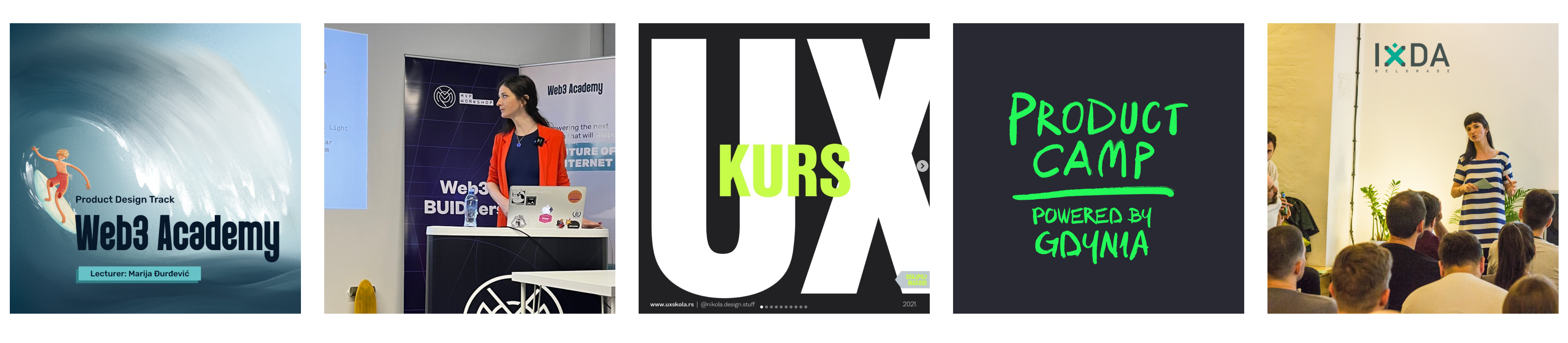 Beyond hands-on design work, I also enjoy sharing my experience through talks and lectures. I've been invited to speak at Web3 Academy, IXDA Belgrade, Product Camp, and the UX Course, covering topics such as dApp design patterns, design systems, user personas, and more.