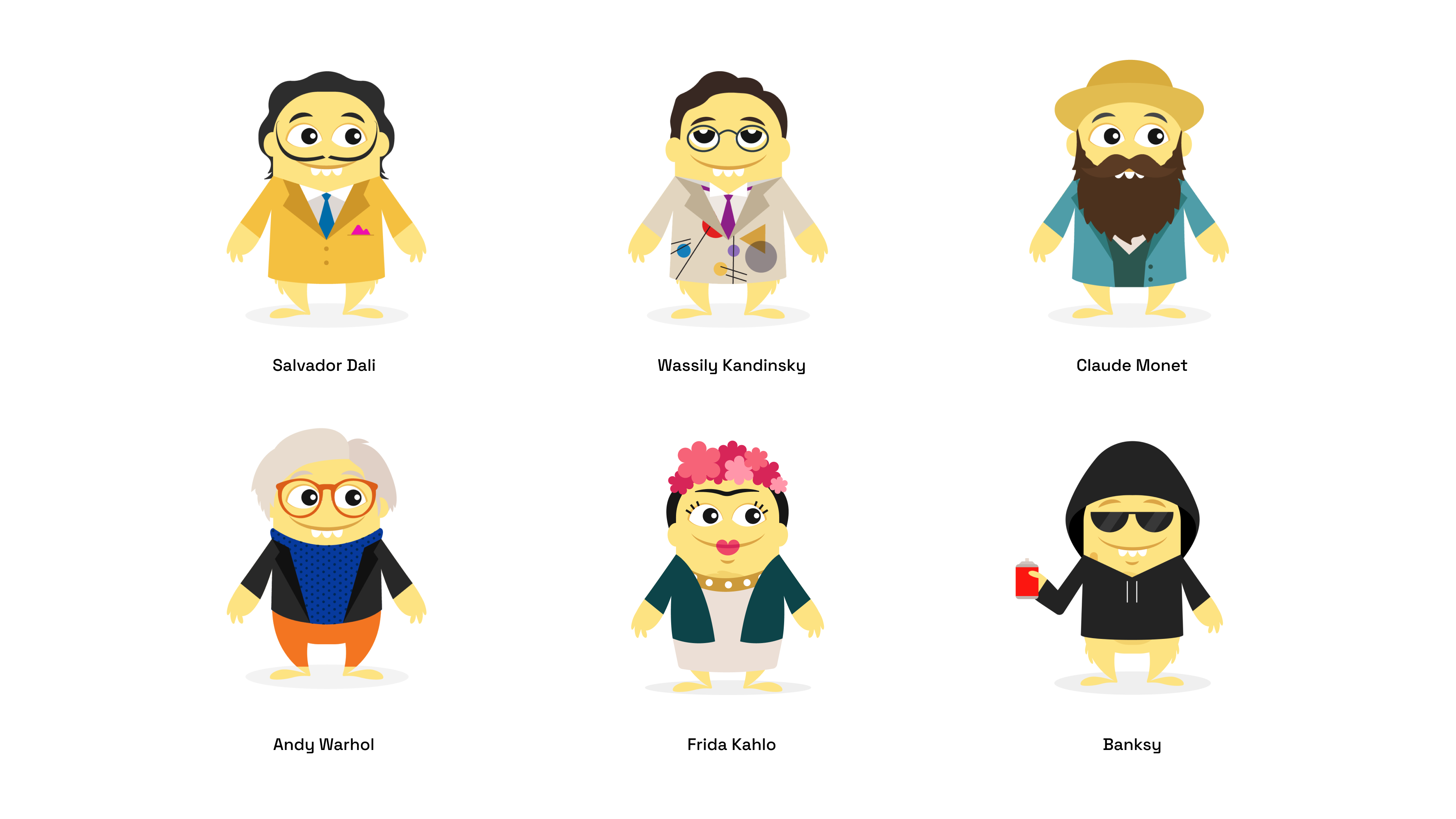 For each artist, we have a custom illustrated character that embodies the visual language of our creatures, adding a playful and unique touch to their presence.