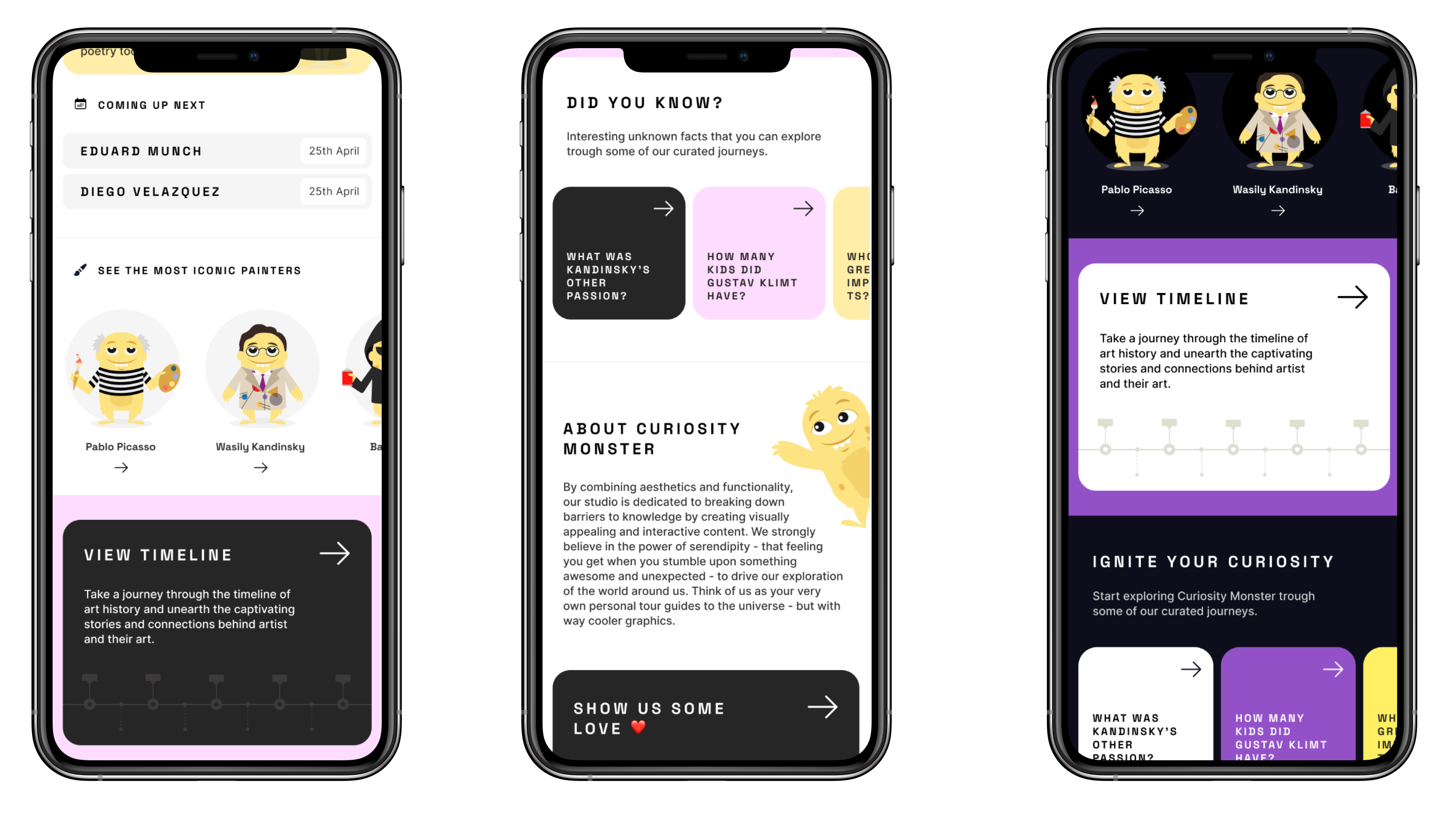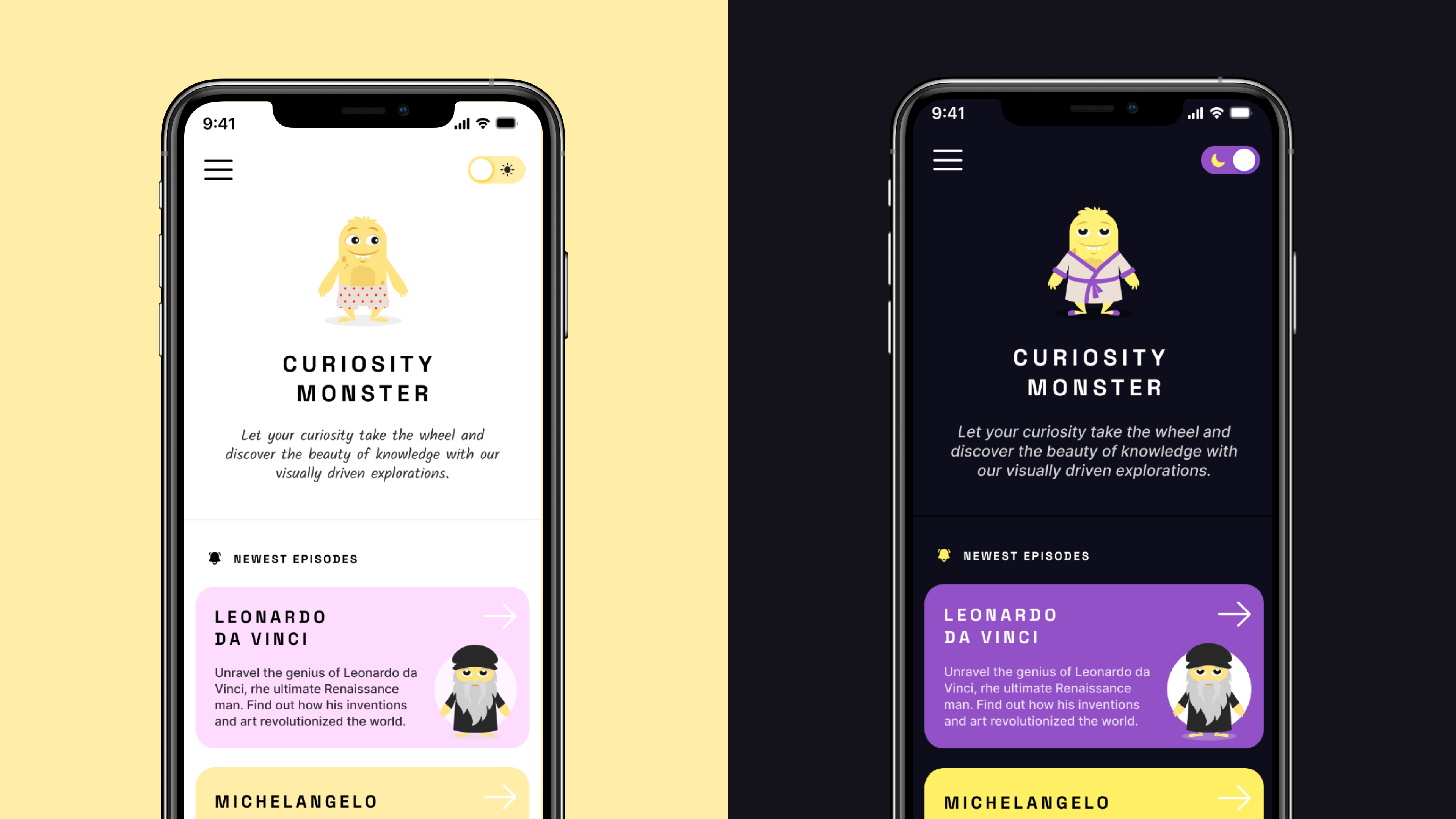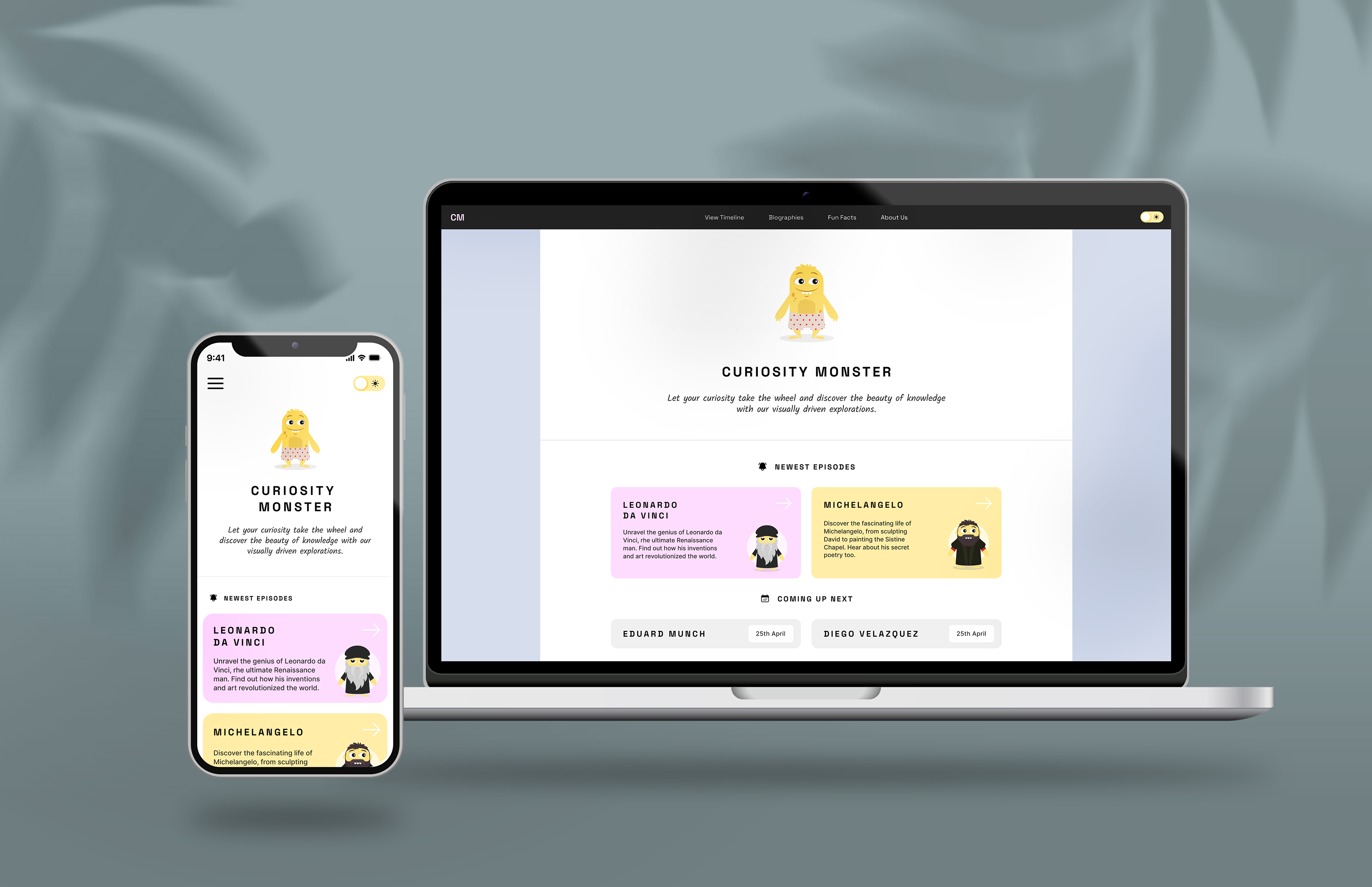 Curiosity Monster's landing page explains how it works, informs about the latest and upcoming episodes and takes us directly to the timeline. It features both light and dark theme displays. Light and dark themes are displayed below.