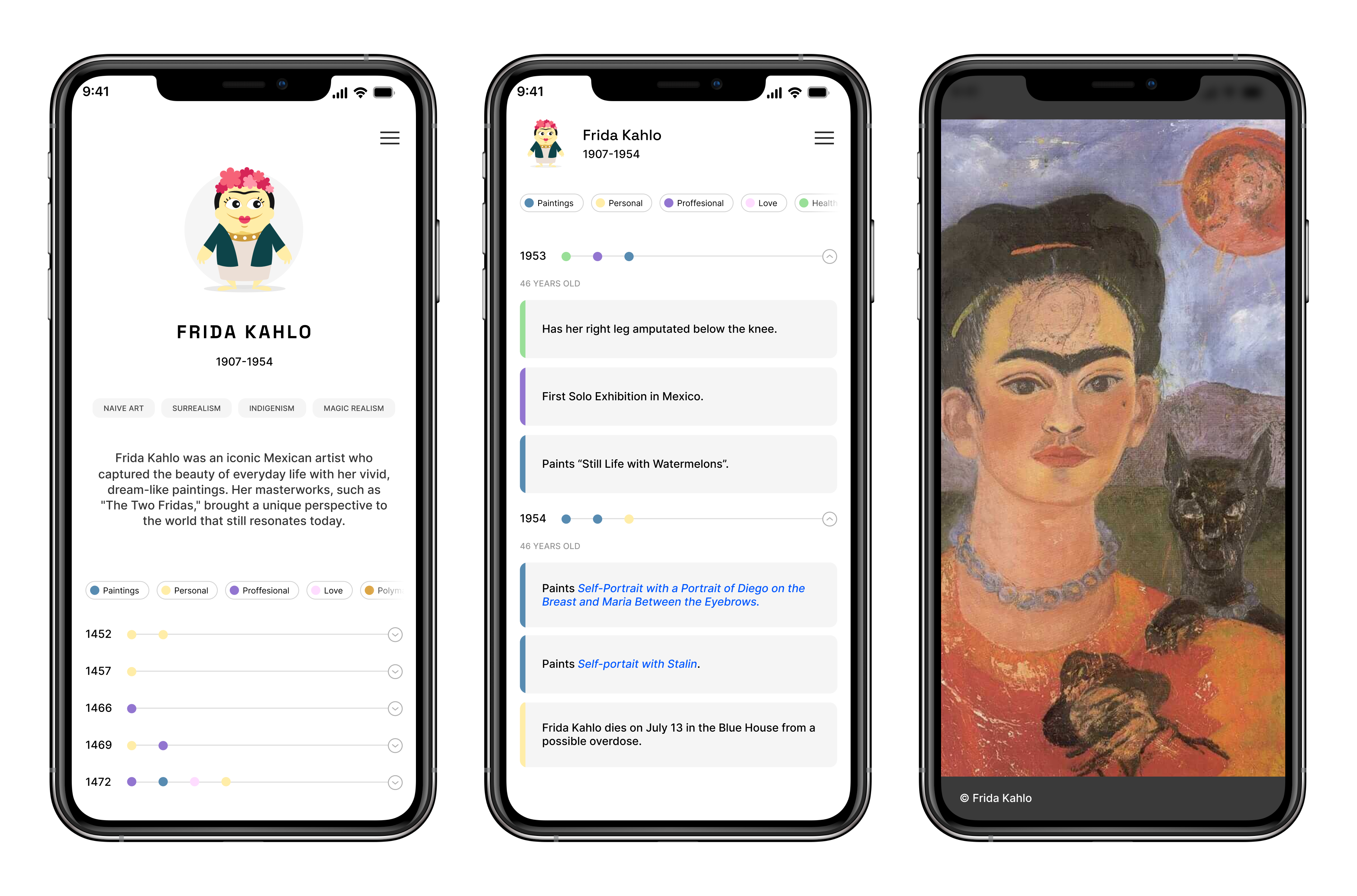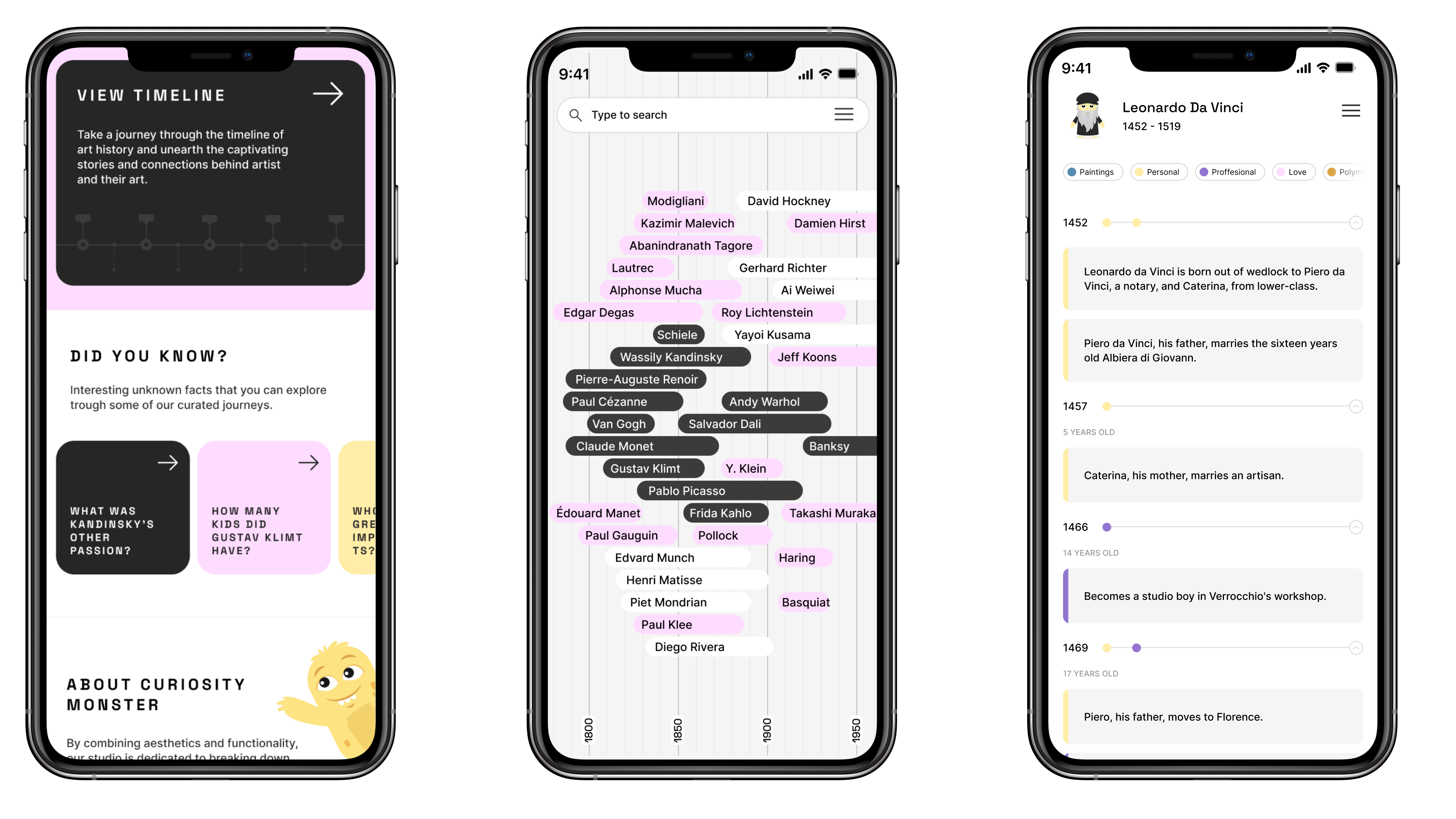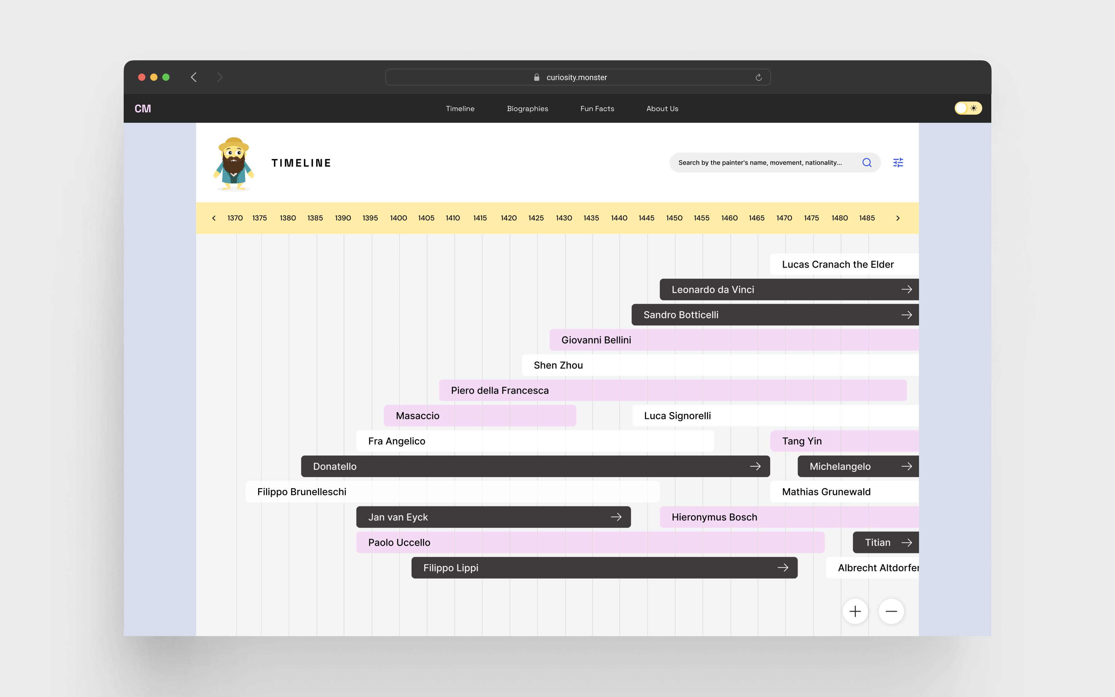 A dynamic timeline featuring various painters, allowing users to seamlessly zoom in or out for a detailed or panoramic view. Additionally, the timeline can be refined through customizable filters, providing a personalized and focused exploration of artistic contributions over time.